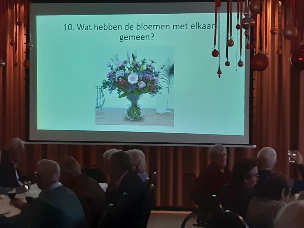 In het Dorpshuis werden de ruim 70 aanwezigen op koffie met wat lekkers en een eerste versnapering getrakteerd waarna de pub quiz werd gespeeld, met zeer fraaie prijzen. De vele vragen hadden betrekking op algemene kennis, muziek, reclame en uiteraard (als bloemendorp) een vragenrondje over bloemennamen. Na veel rekenwerk werden de prijzen verdeeld.